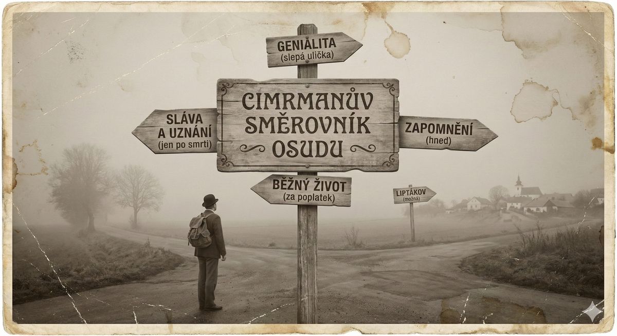 Cimrman, unaven neustálými dotazy saských turistů na cestu do Prahy, se rozhodl na hranicích instalovat svůj patentovaný „Směrovník osudu“. Ten neukazoval cesty podle kilometrů, ale podle potenciálu jedince. V tomto bodě můžeme směle odrazit nepřátelské útoky, že Cimrman prostě jenom opsal část řecké báje o Héraklovi, který se ocitá na křižovatce osudu, kde se setkává s Rozkoší a Cností. Jára však vyvrátil podobné námitky argumentem, že Rozkoš a Ctnost vábí Hérakla ve sféře činů, zatímco on navíc nabízí uplatnění v určitém regionu.
