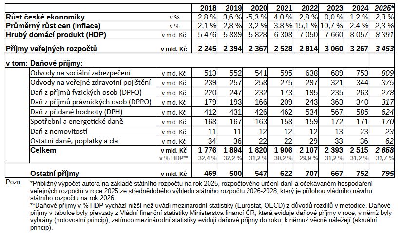 Tabulka níže zachycuje vývoj veřejných příjmů v letech 2018-2024 a též uvádí rozpočtované hodnoty pro rok 2025: