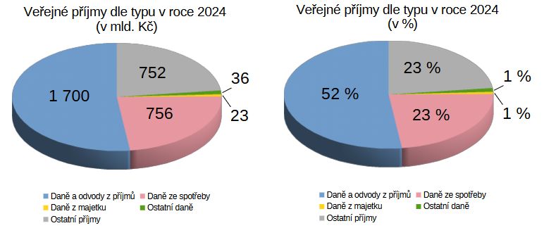 Podrobnější rozdělení veřejných příjmů mezi státní rozpočet a jiné veřejné rozpočty v roce 2024 znázorňuje tabulka níže. Výše uvedené grafy byly vytvořeny na základě hodnot z této tabulky.