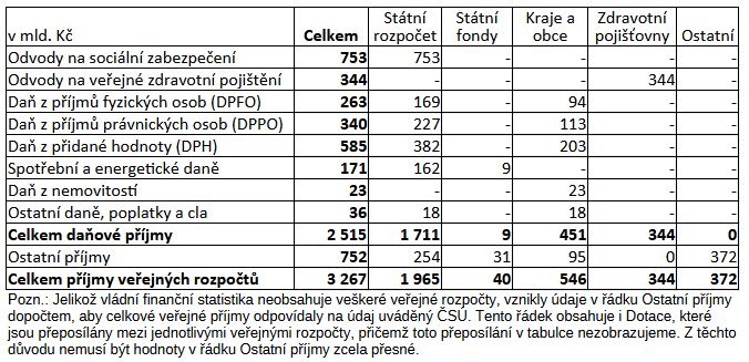 Přeposílání finančních prostředků mezi státním a jinými veřejnými rozpočty, jako jsou například dotace z Evropské unie, v tabulce nezobrazujeme. Stejně tak v ní není zachycena například platba státu zdravotním pojišťovnám (151 mld. Kč) za veřejné zdravotní pojištění státních pojištěnců.