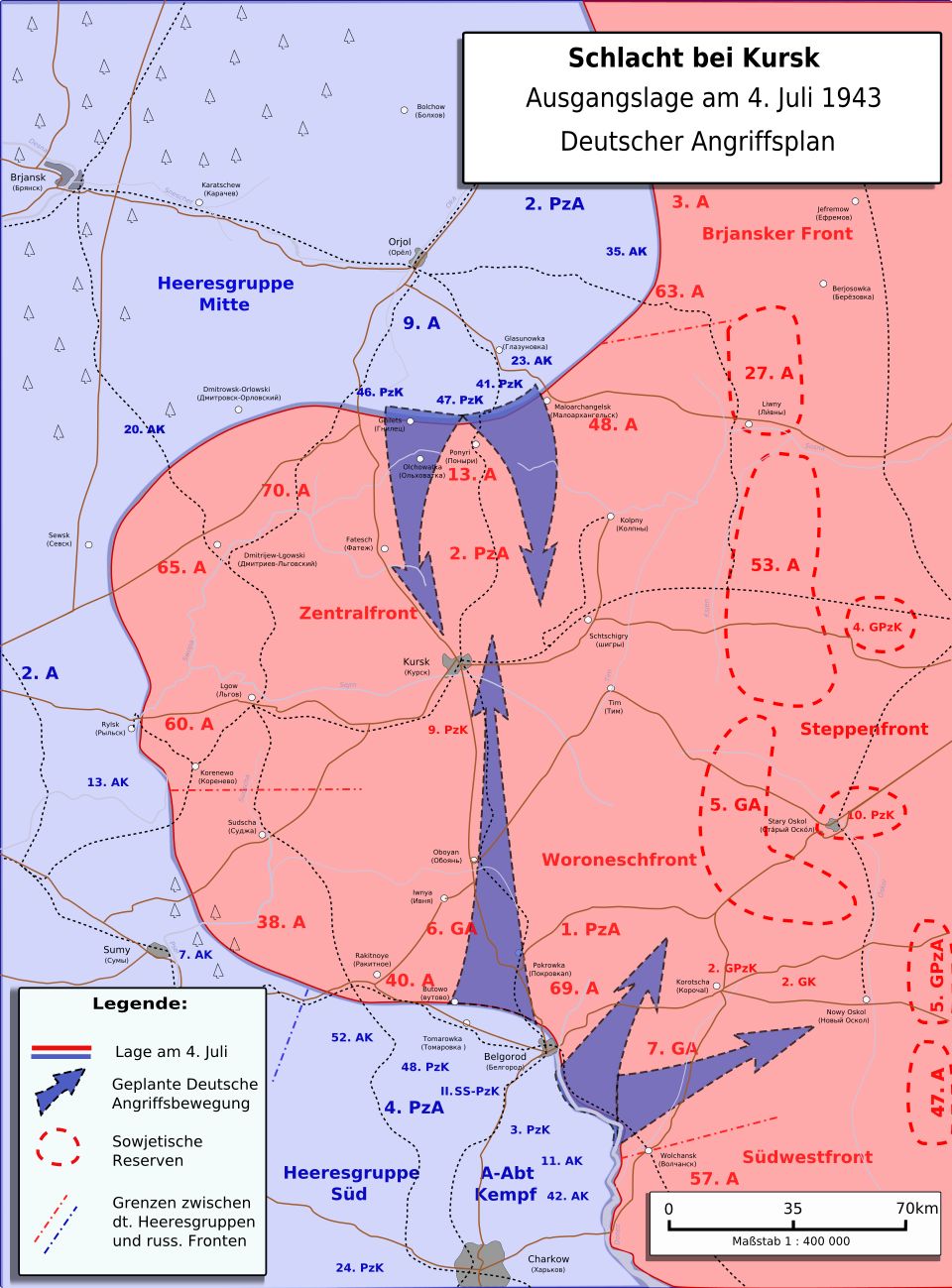 Příslušná ofenzíva součástí Wehrmachtu má kódový název „Operace Citadela“. Z Armádní skupiny „Mitte“ generála polního maršála G. von Kluga zaútočí IX. armáda generálplukovníka W. Modela po severním křídle od města Orel a z jihu od Bělgorodu proti ní na sever ke Kursku a na severovýchod k Starému a Novému Oskolu z Armádní skupiny „Süd“ generála polního maršála E. von Mansteina vyjede IV. tanková armáda generálplukovníka H. Hotha. Obě hlavní skupiny se setkají u Kurska.