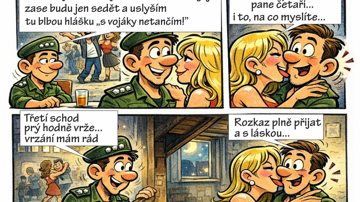 Měl jsem hodnost četaře. Na výložkách tři stříbrné pecky. V kasárnách to něco znamenalo. Člověk měl zodpovědnost, pod sebou pár kluků, musel stát rovně a mluvit jasně. Ale jakmile jsem si vzal civil a vyrazil do města, pecky sice zůstaly, ale svět fungoval jinak.