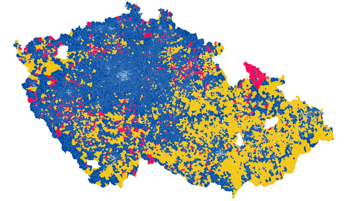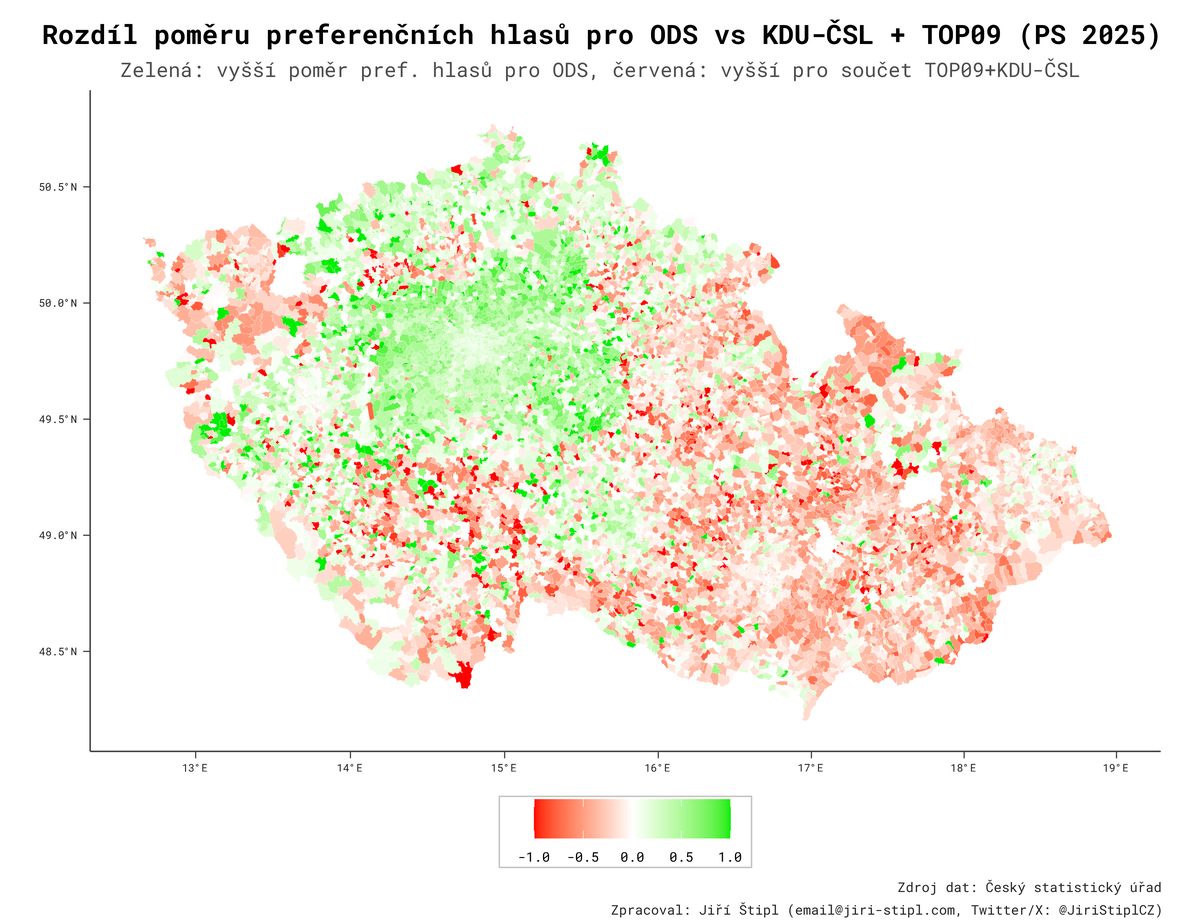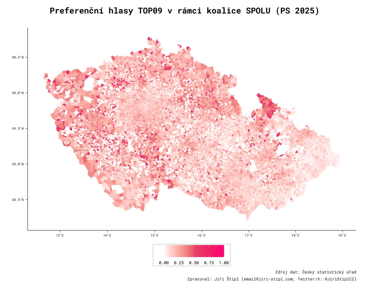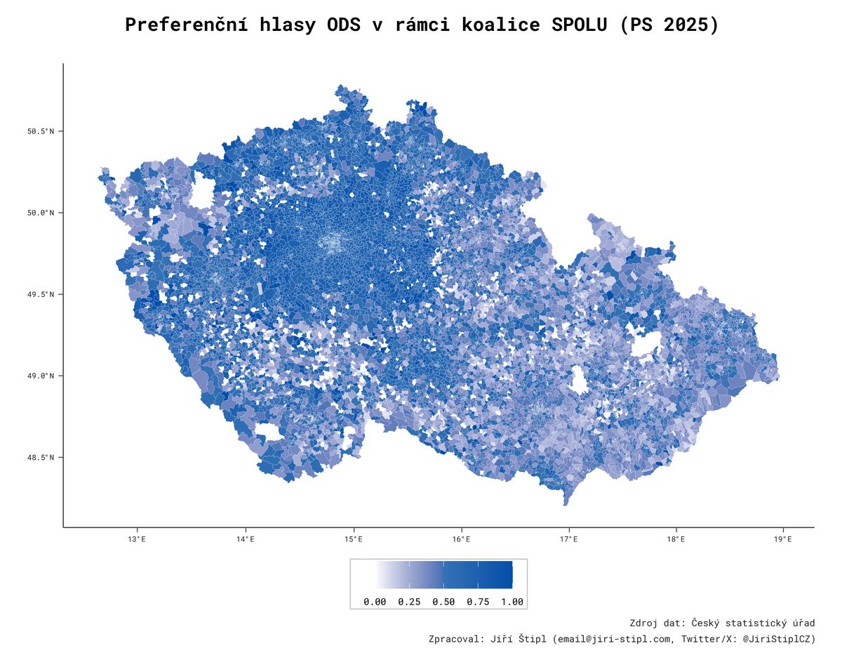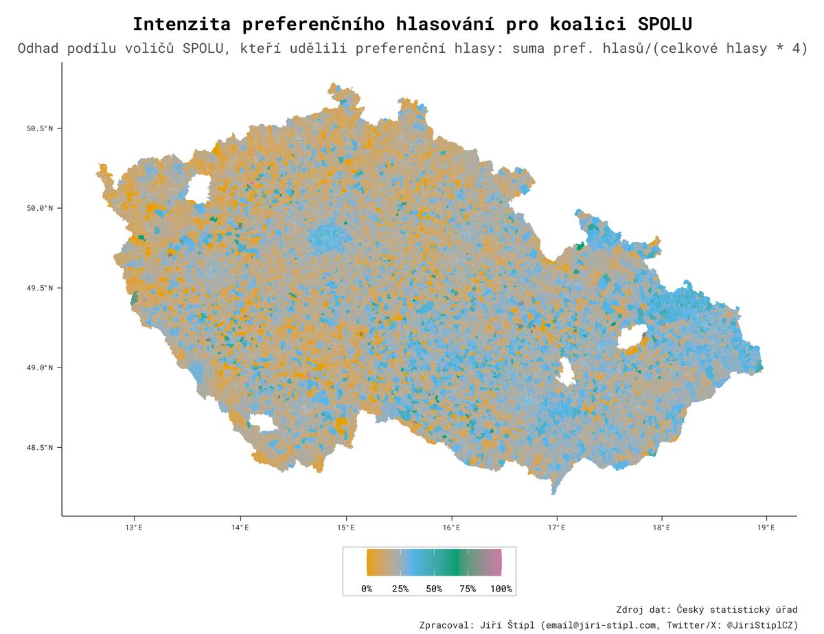 Na mapě níže vidíme, že nad průměrnou intenzitou kroužkování 25,4 % koalice SPOLU jsou zejména oblasti na Moravě, ve Slezsku a Praha (modré zbarvení).