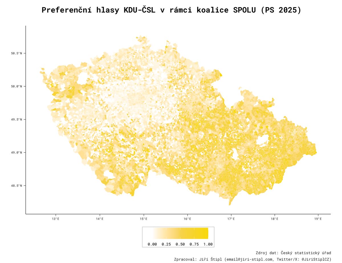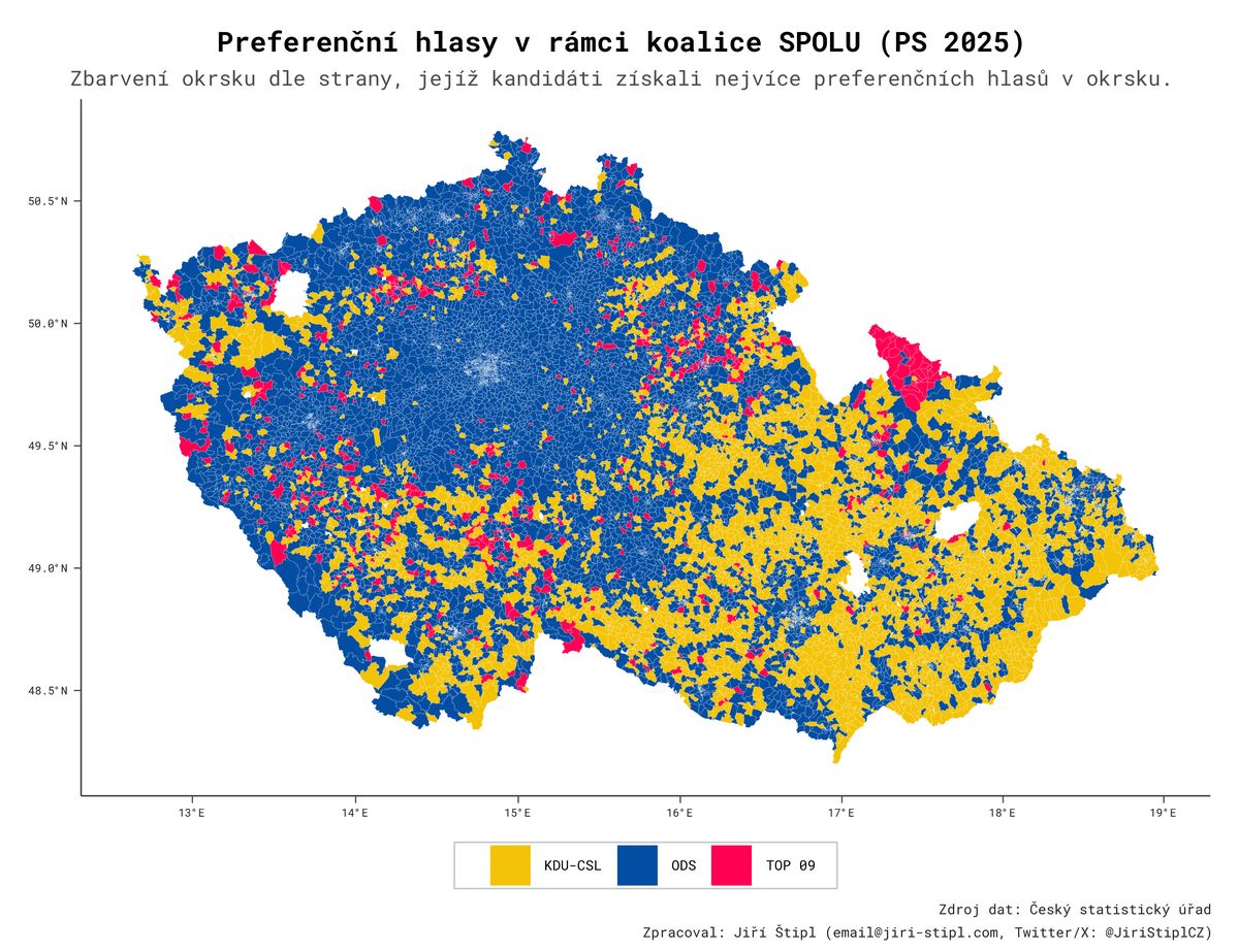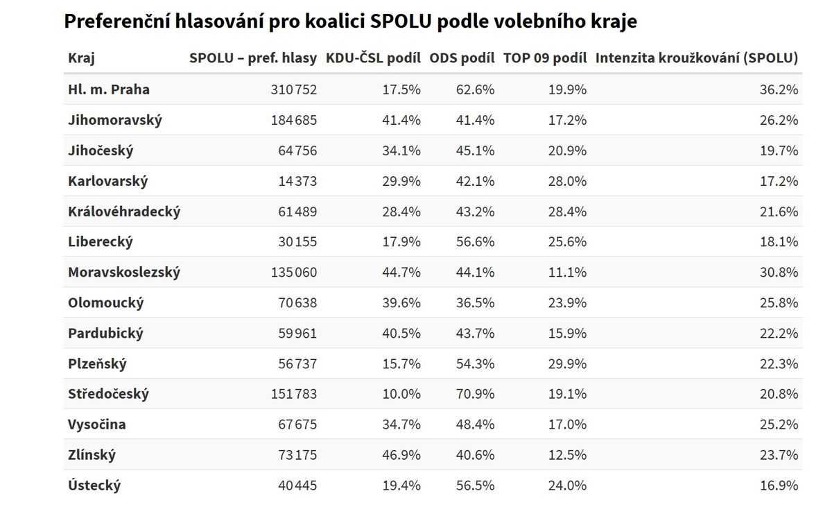 Z 52 mandátů získaných koalicí SPOLU připadlo 27 na kandidáty navržené ODS, 16 KDU-ČSL a 9 TOP09. Kandidáti KDU-ČSL zřetelně získali podstatnou část preferenčních hlasů na Moravě. Naopak síla TOP09 je zřejmě hlavně v Javornickém výběžku…