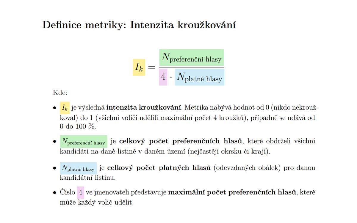 Pro každou kandidátku je odevzdán určitý počet obálek obsahujících platné hlasy, každý volič může udělit maximálně 4 preferenční hlasy, takže pokud tento počet platných obálek vynásobíme čtyřmi, získáme maximální možný počet udělených kroužků v rámci dané kandidátky. Pokud sečteme všechny udělené kroužky v dané kandidátce a vydělíme je tímto maximálním možným počtem kroužků, získáme metriku, kterou nazývám intenzita kroužkování, viz také obrázek se vzorečkem níže.