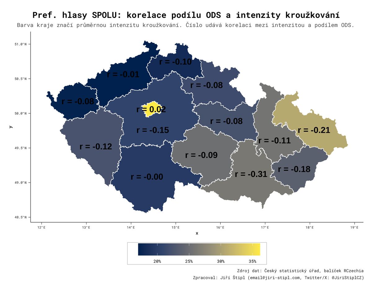 Velmi zajímavým údajem je korelace mezi intenzitou kroužkování koalice SPOLU a podílem preferenčních hlasů pro ODS. Na mapě níže se dozvídáme, že ve všech krajích kromě Prahy znamenala vyšší intenzita kroužkování vždy menší podíl kroužků pro ODS. Zdaleka nejvýraznější byl tento efekt v Jihomoravském kraji, kde je míra korelace mezi intenzitou a podílem kroužků pro ODS r=-0.31.