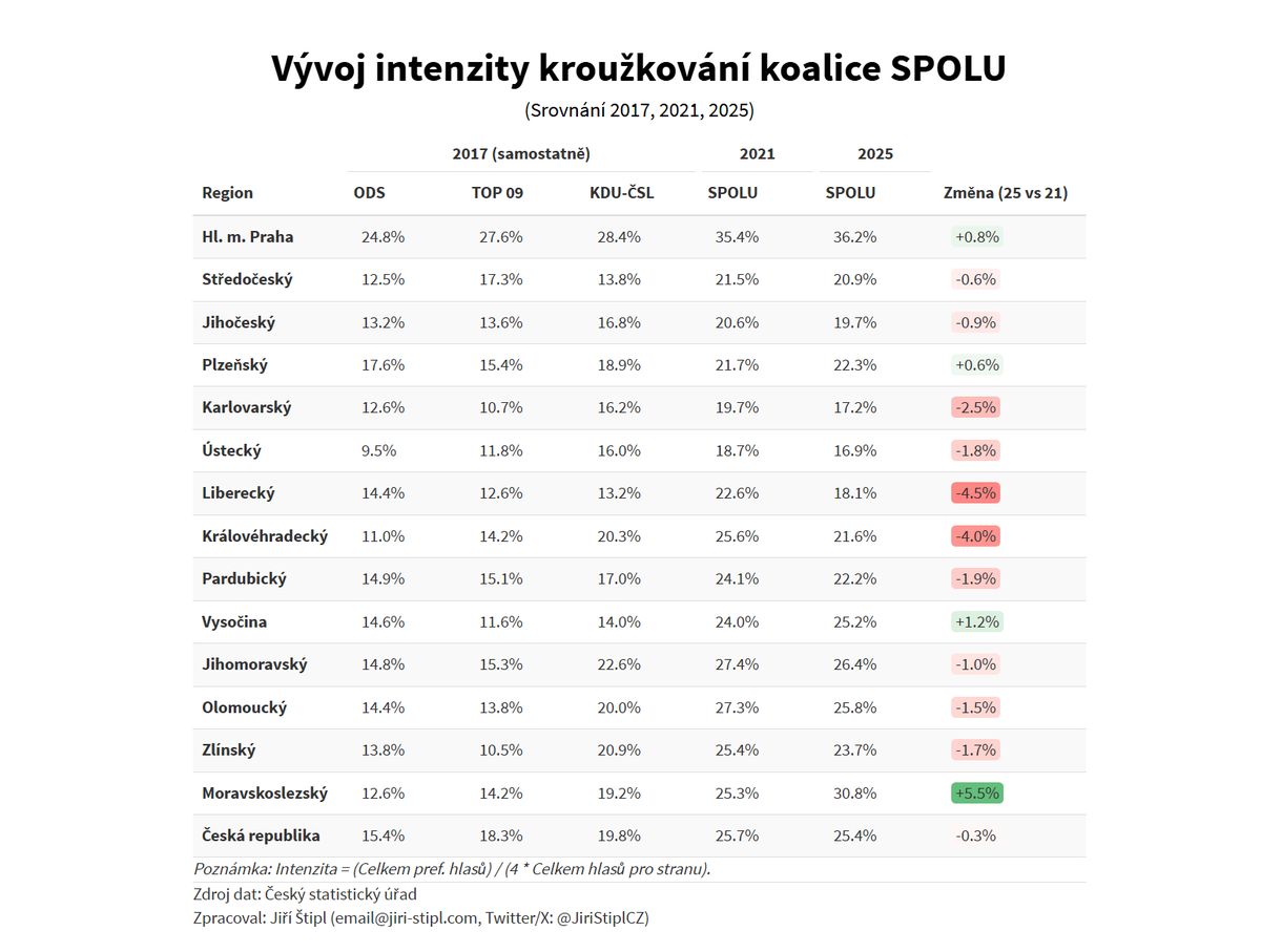 Z tabulky níže vyplývá, že spojení ODS, KDU-ČSL a TOP09 v koalici SPOLU vedlo k jasnému zvýšení intenzity kroužkování v roce 2021 oproti roku 2017, kdy každá ze stran kandidovala samostatně. V právě proběhlých volbách se v koalici SPOLU celková intenzita kroužkování snížila o 0.3 % (procentního bodu). Tedy pouze nepatrná změna, nicméně mezi jednotlivými kraji jsou velké rozdíly. Největší změna je v Moravskoslezském, kde se kroužkovalo o 5.5 % více, hlavním důvodem zřejmě bylo kroužkování proti současnému ministru financí Zbyňku Stanjurovi (ODS). Naopak v Libereckém kraji se kroužkovalo o 4.5 % méně, zřejmě zde SPOLU nabídlo méně výrazné osobnosti než v roce 2021, ale do hloubky místní situaci neznám.