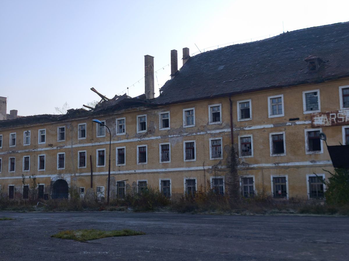 Chátrající vojenská budova s takzvaným buzerplacem v Terezíně