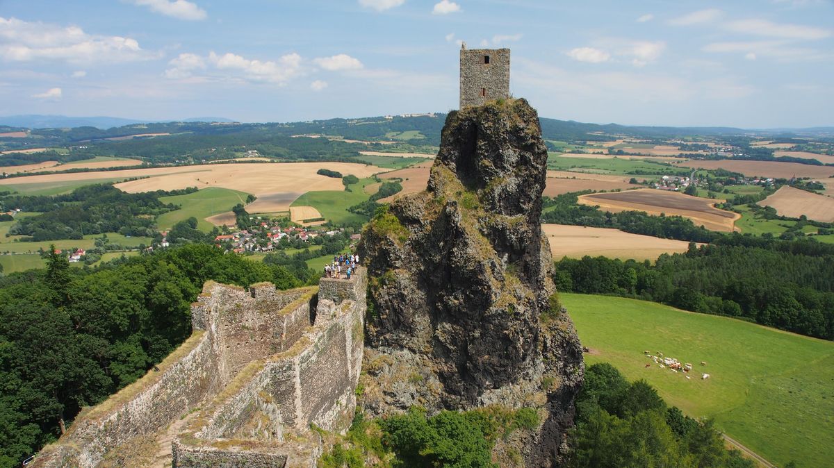 Hrad Trosky je budován na terciérních vulkanitech. Jejich formace je podobná těm z lomu Střeleč - rozdíl je ale v tom, že zde není vulkanit kvůli své vyšší poloze obalen sedimenty. Kdyby však byl, interpretovali bychom to automaticky jako jeho průraz těmito sedimenty? Či nikoliv? Zdroj: Dcpeets/Wikipedia (licence https://creativecommons.org/licenses/by-sa/4.0/deed.en)