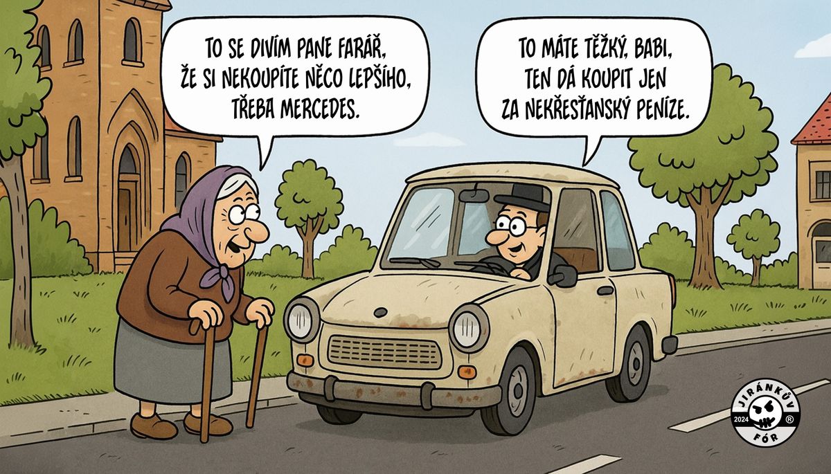 Proč by si farář nikdy nekoupil mercedes? Odpověď se dozvíte v tomto vtipu.
