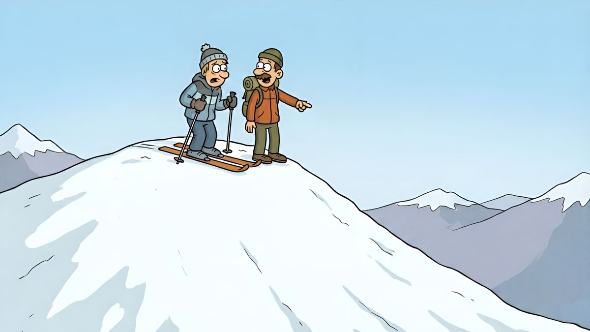 Při každé sportovní činnosti by měl člověk objektivně posoudit svoje schopnosti a případná rizika, stejně jako lyžař z tohoto vtipu.