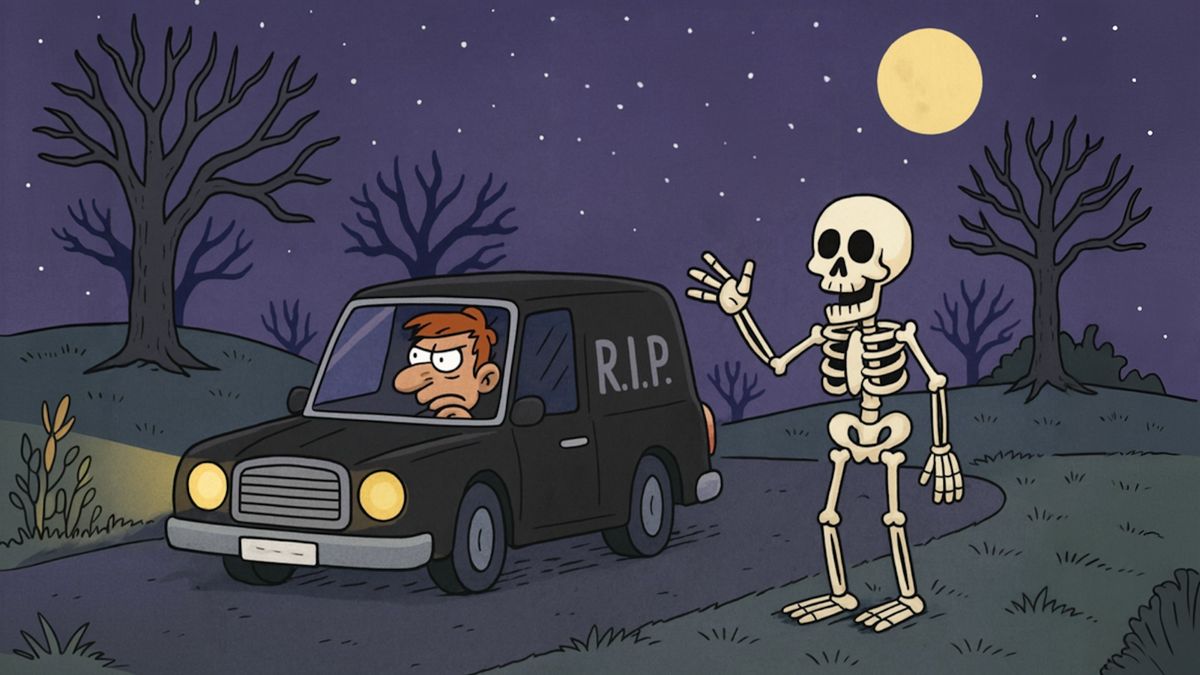 O Halloweenské noci by vás nemělo nic překvapit. Třeba ani to, když uvidíte kostlivce, který mává na pohřební vůz.