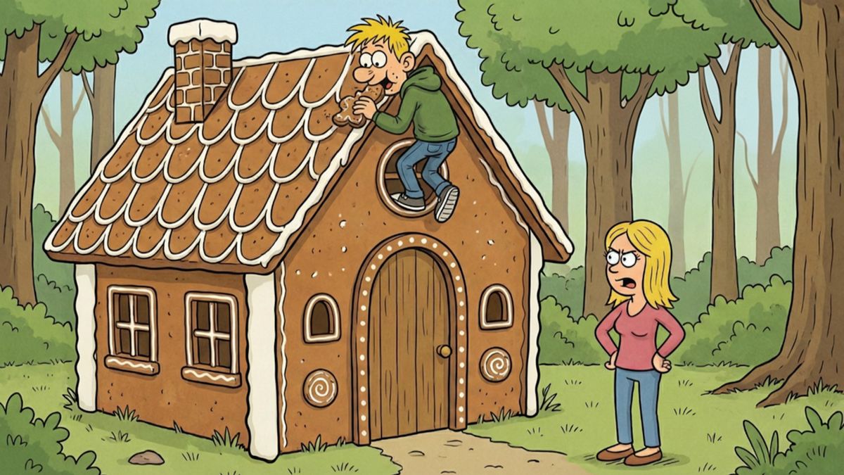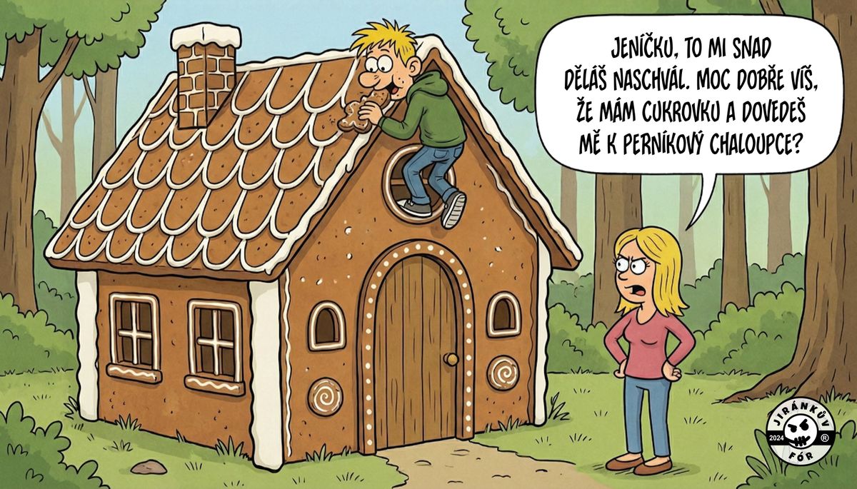 V tomto vtipu vás zavedeme k perníkové chaloupce, kde si Jeníček pochutnává na střešních taškách, ale Mařenka dole před ní nespokojeně brblá.