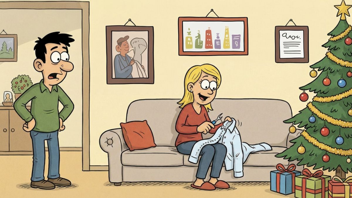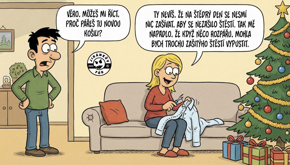 Na Štědrý den se prý nesmí nic šít ani plést, abyste si nezašili štěstí. A ví to i žena v tomto vtipu.