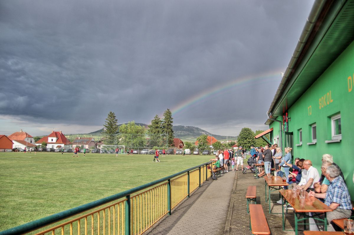 Závěrem se ještě podívejme na hřiště, bez kterého by žádný sportovní klub neobejde. V počátcích Sokola se fotbal hrál na konci ulice Polní, toto hřiště však nedostačovalo, takže členové Sokola v roce 1949 začali budovat nové hřiště s kabinami na stávajícím místě na konci ulice U Rybníka. Kolem hřiště vysadili topoly a postavili oplocení. V roce 1951 bylo přistavěno sociální zařízení a přidány hodiny. Větší úpravy kabin, bariéry kolem hřiště a celého zázemí probíhaly ve výročních letech 1965 a 1975, generální oprava v roce 1981. Velká rekonstrukce pak proběhla až v novém tisíciletí. Na podzim 2001 byly po skončení fotbalové sezony pokáceny prosychající topoly a hlavní hřiště bylo posunuto blíže k potoku, čímž vznikl prostor pro tréninkové hřiště, které bylo zaseto 24. 6. 2002. Na něm se začaly hrát mistrovské zápasy již v roce 2003, kdy zároveň začaly terénní úpravy na stavbu tenisových kurtů a hlavního travnatého hřiště, které bylo zaseto 13. 9. 2003. Po skončené fotbalové sezoně byly zbořeny staré kabiny a ještě do konce roku byly zhotoveny základy nových kabin a postavena hrubá stavba. V roce 2005 byly položeny stropy, zhotovena střecha a 16. 7. 2005 byl nový sportovní areál předán Sokolu k užívání.