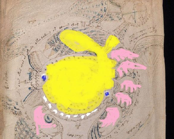 Vrcholem autorského šifrování a ironie je pasáž na velkém rozkládacím pergamenu. Zde se nachází kresba „Zlaté ryby“, která má dvě modré oči, velký úsměv od ucha k uchu a mává rukou na všechny světové vědce.