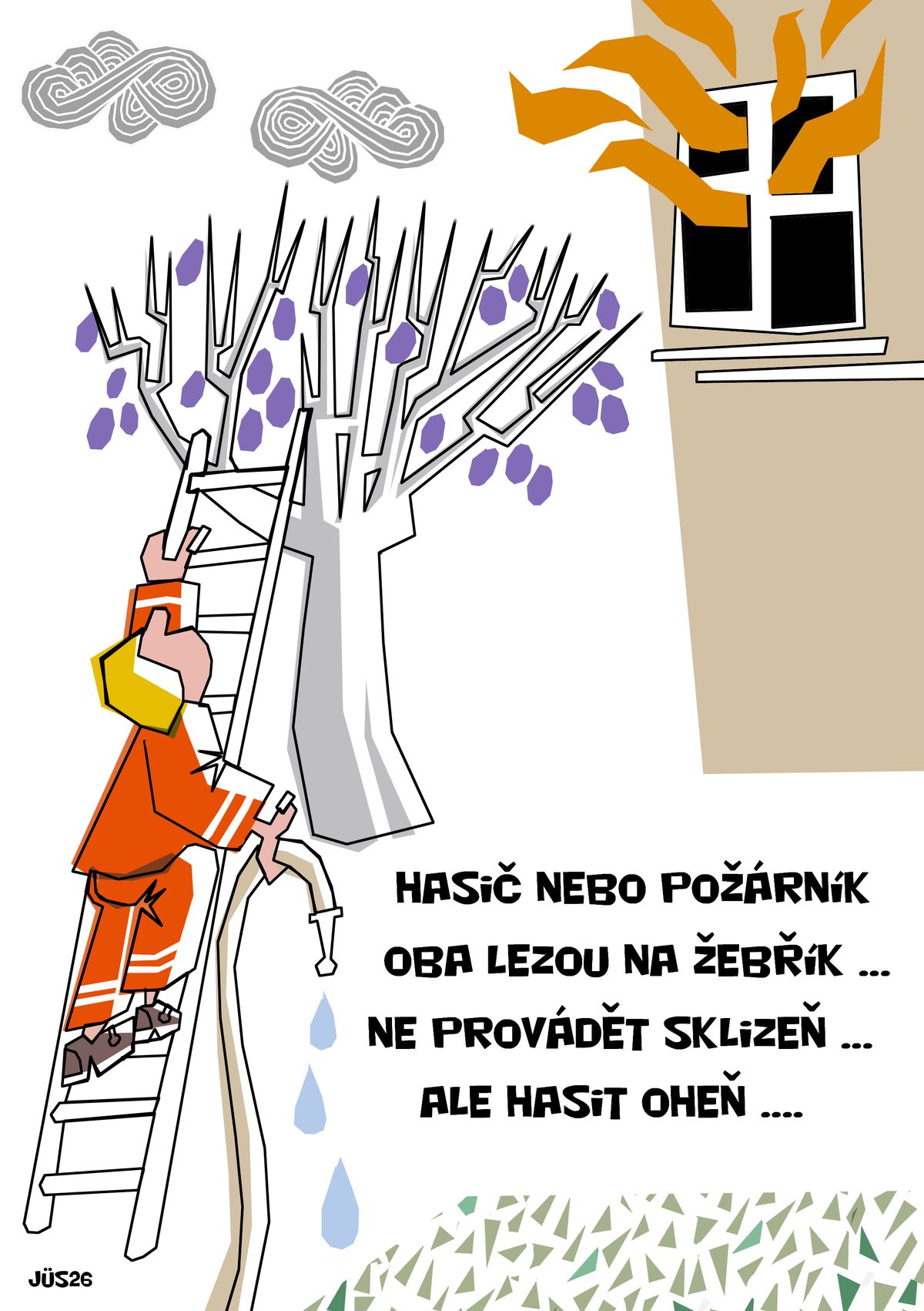 Hasič nebo požárník, oba lezou na žebřík. Ne provádět sklizeň, ale hasit oheň.