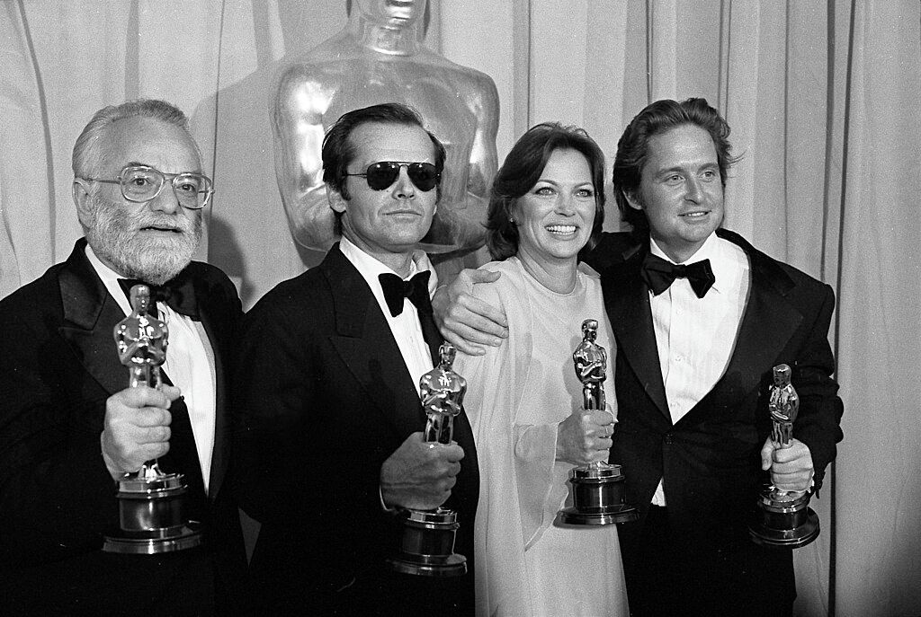 Jack Nicholson a tvůrci filmu Přelet nad kukaččím hnízdem s Oscary - 1976.