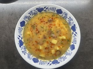 - Rajská s těstovinami a opečené klobásy – vařeno na dva dny, druhý den chutná stejně dobře.