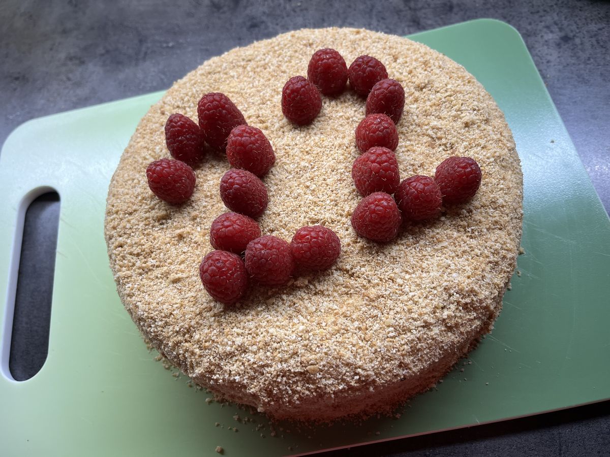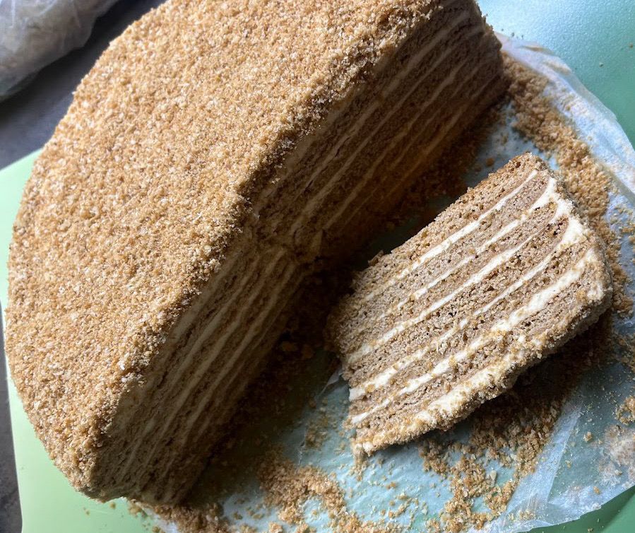Potřený plát těsta + krém až dokonce. Po té potřeme i kraje medovníku a zasypeme rozemletými okraji a přitlačíme. Pak už jen čekat do druhého dne.