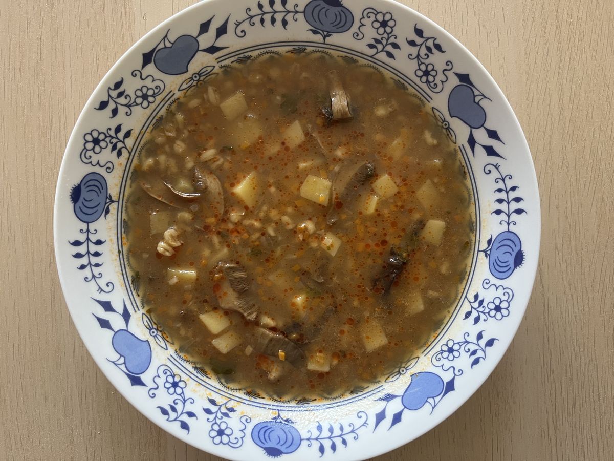 Nejdříve si zhruba 10 minut podusíme houby. V hrnci osmahneme cibuli na drobno. Přidáme kroupy a zalejeme vodou. Přidáme koření a vaříme do poloviny času přípravy krup. Přidáme houby a zeleninu. Uvaříme do měkka. Z oleje, paprik a mouky vytvoříme zásmažku a polévku zahustíme. Provaříme a ochutíme.