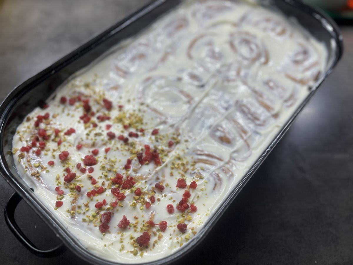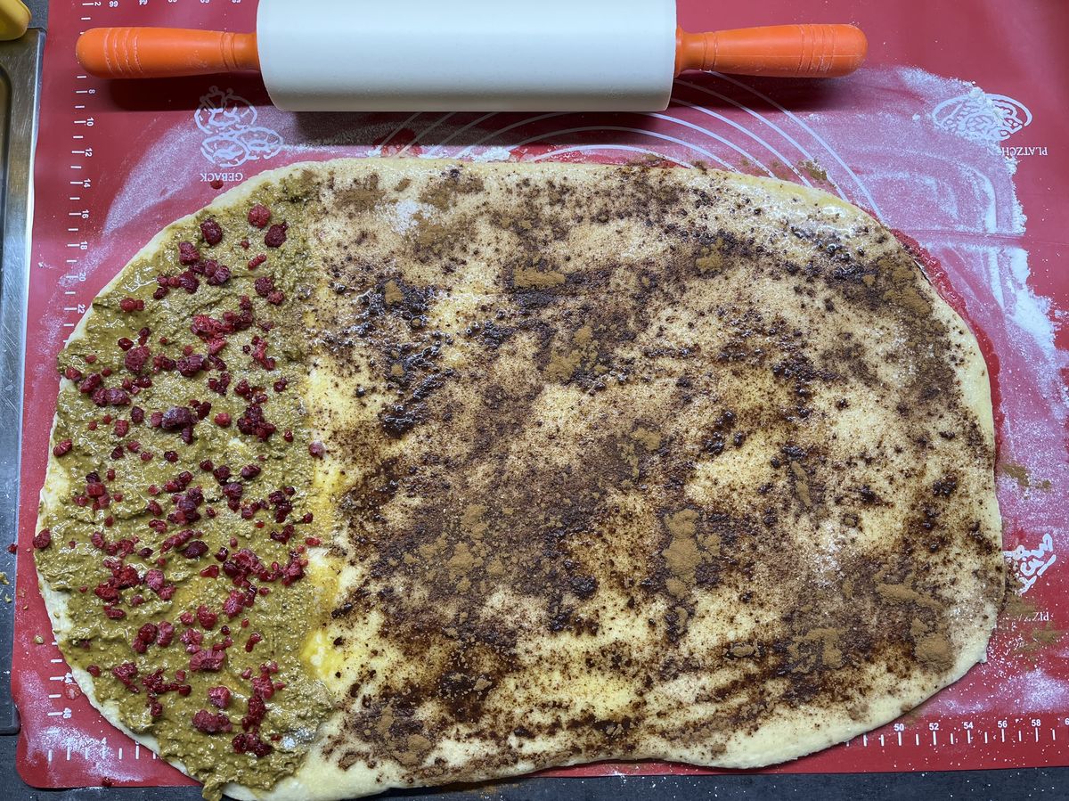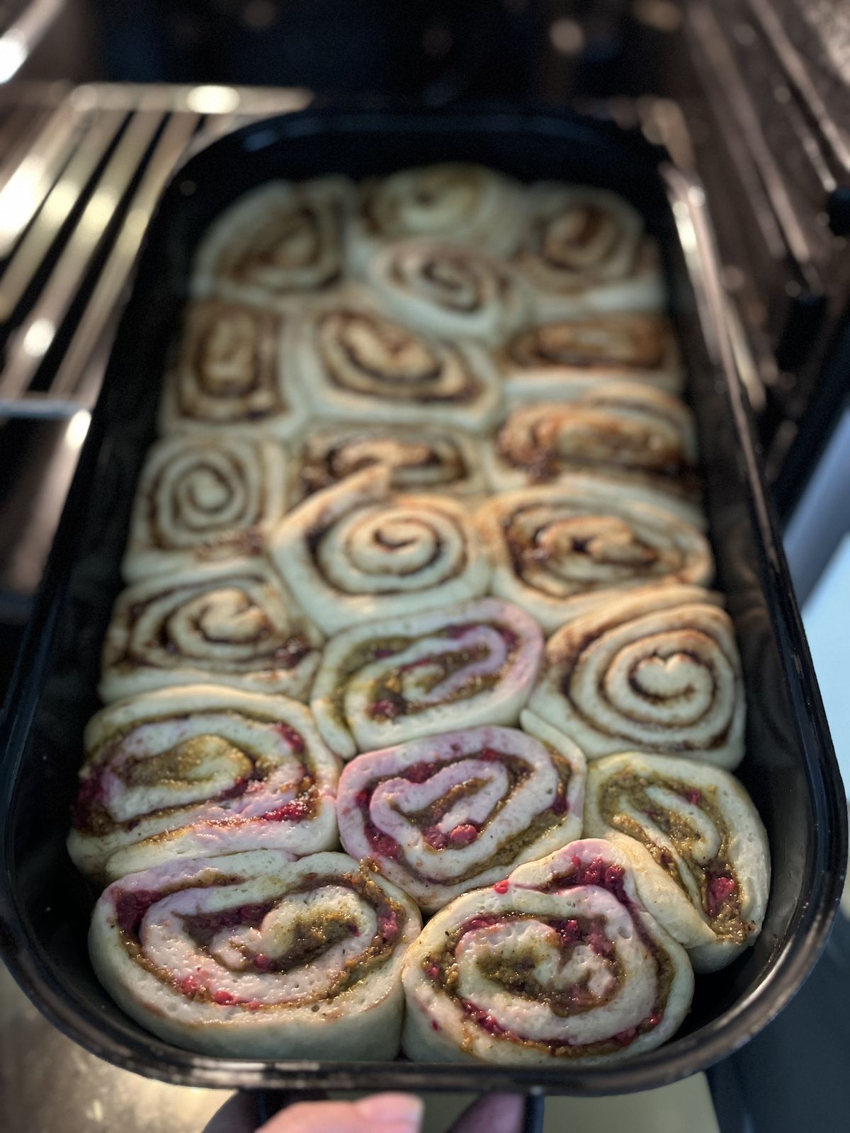 Do mísy dejte cukr, vlažné mléko a rozpuštěné máslo. Vše promíchejte a přidejte sáček sušeného droždí opět promíchejte, přikryjte a nechte na teplém místě 10-20 minut odpočívat. Po té přidejte mouku, sůl, vejce a minimálně 5 minut zpracovávejte. Nechejte 2 hodiny kynout. Po té vyválejte 30×50 cm. Potřete ho rozpuštěným máslem, posypte třtinovým cukrem a nakonec skořicí. Já zkusila i část - pistaciové máslo a trocha mražených malin (bylo to výborné). Těsto zamotejte do rolády a nakrájejte na 12 stejných dílků. Ty potom naskládejte do plechu na pečící papír a nechte znovu 20 minut kynout. Peče se na 180° okolo 15 minut. Vychladlé potřeme polevou pokud chceme nebo posypeme moučkovým cukrem.