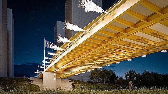 Zcela netradičním prvkem nového mostu Na Karolině je jeho „ohnivý“ efekt. Podle návrhu architekta Romana Kouckého bude konstrukce při vybraných slavnostních příležitostech doplněna o speciální plynové trysky, které vyšlehnou plameny do prostoru nad řekou Ostravicí. Most tak nemá být jen dopravní stavbou, ale i výraznou městskou dominantou a symbolickým odkazem na průmyslovou minulost Ostravy, kde oheň patřil k běžné součásti krajiny hutí a koksoven. Ohnivé efekty mají fungovat jako součást scénického nasvícení a budou využívány pouze výjimečně, například při významných událostech, aby podtrhly výjimečnost místa i samotné stavby.