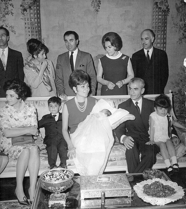 Rodina Pahlaví v roce 1966 - vpravo sedí panovník s dcerou Farahnaz (1963), uprostřed Farah s novorozeným Alím (1966 - 2011). Šestiletý Kýros je mezi matkou a nejstarší šáhovou dcerou Šahnáz (1940) z prvního manželství, která je jen o dva roky mladší, než „macecha“.