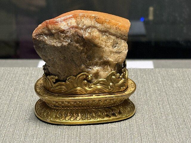 A přece takové unikátní kousky existují. Jedním z nich je plátek „bůčku“ ze zlata a neopracovaného jaspisu, který je součástí národního pokladu uloženého v Národním palácovém muzeu v Tchajpeji. Dostal se sem v roce 1949 spolu s dalšími klenoty z císařského Zakázaného města, když se z pevninské Číny stahovala po prohře v občanské válce s komunisty konzervativní strana Kuomintang se svými příznivci.