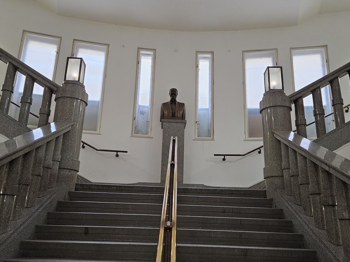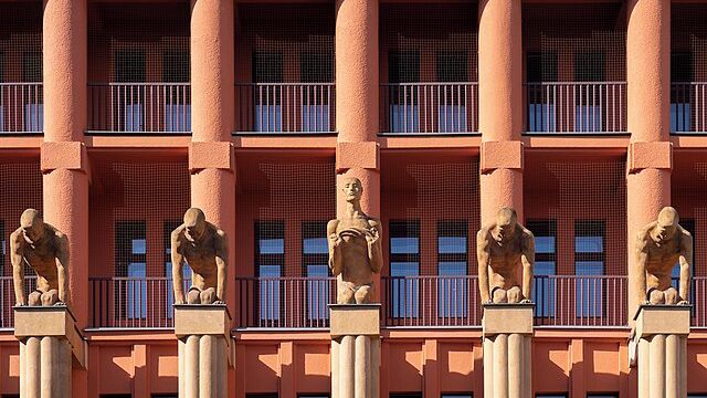 Průčelí nezapře funkcionalismus okořeněný špetkou egyptské monumentálnosti, korunované gigantickým sousoším 7 mužských postav nazvaným Zdraví