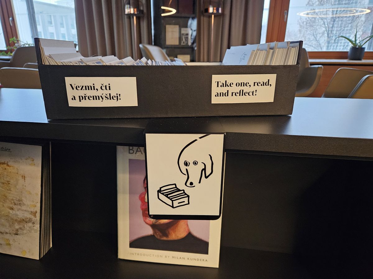 Místnost v prvním patře, která tak trochu „levituje“ nad ulicí a knihovním bistrem v přízemí, je příjemným prostorem, který architekt Martin Hrdina pojal se svými kolegy jako místo k setkávání u kulatého stolu. Ale nechybí tu ani zákoutí s pohodlnými křesílky pro samostudium nebo přemýšlení nad citáty. Ty si můžete volně vylovit z krabice vyzývající návštěvníky „Vezmi, čti a přemýšlej“.