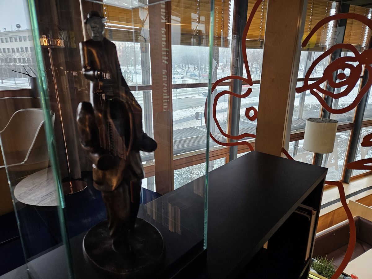 Když na chvíli zvednete oči od stránek, můžete si připadat, jako když levitujete nad okolní ulicí. Nebo si můžete zblízka prohlédnout Cenu Franze Kafky (plastiku od sochaře Jaroslava Róny), kterou Kundera dostal v roce 2020.