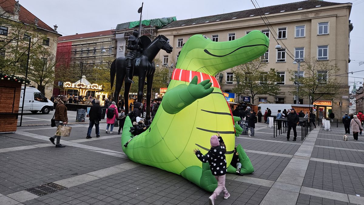 Symbolem Brněnských Vánoc je krokodýl neboli „brněnský drak“ s doplňky v barvách města