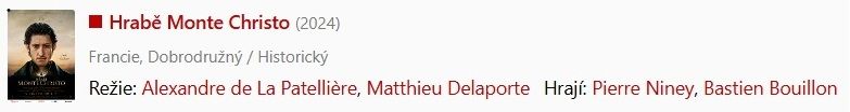 Šesté zpracování v krátké době, to je přesně ta hranice, kdy už se člověk na film nedívá s takovým zaujetím. Nicméně na francouzské verzi z roku 2024 je opět patrné, že i vývoj zpracování historických filmů jde jasným směrem. Ač nejde o Hollywood, každá scéna musí být pompézní jak Piráti z Karibiku, zpracování musí být co nejakčnější (začínáme ve skutečně působivé mořské bouři), máme zde posílení podílu ženského elementu (a tak nám vstupuje na scénu sestra prokurátora Willeforta), samotný hlavní hrdina nám musí ukázat své okázalé hrdinství a správňáckost hned na začátku, zatímco jeden se zlounů nám hned v první scéně předvede svou čistokrevnou špatnost. Na druhou stranu, žádné progresivistické woke výstřelky se nekonají. Montego (zde od začátku nazývaný de Moncerf), rival v ucházení se o ruku Mercedes, je opět kámoš, od kterého by hlavní hrdina pochopitelně zradu nečekal (podobně ve zpracování z roku 2002). Tvůrcům nelze upřít snahu dát si s každou scénou práci, ale ač nechci vypadat jako nenapravitelný staromilec, po celou dobu sledování mám pocit, že se natáčí podle „příručky pro současného diváka“. Mnoho je toho pozměněno, což mi kupodivu nevadí, při v pořadí šestém sledování stejného příběhu je to naopak příjemným osvěžením. Možná začnu chápat ty divadelní režiséry, kteří nám občas zprzní nějaký klasický kus (pokud to nepřeženou, což je dnes spíše pravidlem). Úvod je tedy pojat poněkud svérázně a se značnou tvůrčí fantazií, ale funguje docela dobře, zato vězení (zase trochu jiné než v předchozích verzích) na mě nijak nezapůsobilo, ani chemie mezi Edmondem a abé Faríou příliš nefunguje (zatímco mezi Edmondem a Mercedes ano, což dělá toto zpracování v tomto směru jedinečným). Pomsty jsou opět trochu uspěchané, ale bez mučení se přiznávám, že pro hodnocení tohoto zpracování už mi nezbylo moc soustředění, mohu jen říci, že ani této verze není třeba se vůbec bát.
