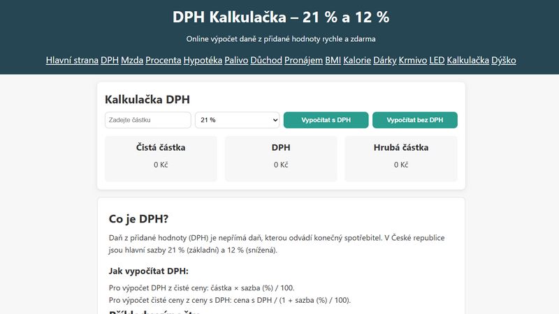 - ✅ Okamžité výsledky – zadáte částku a ihned vidíte čistou cenu, DPH i hrubou cenu