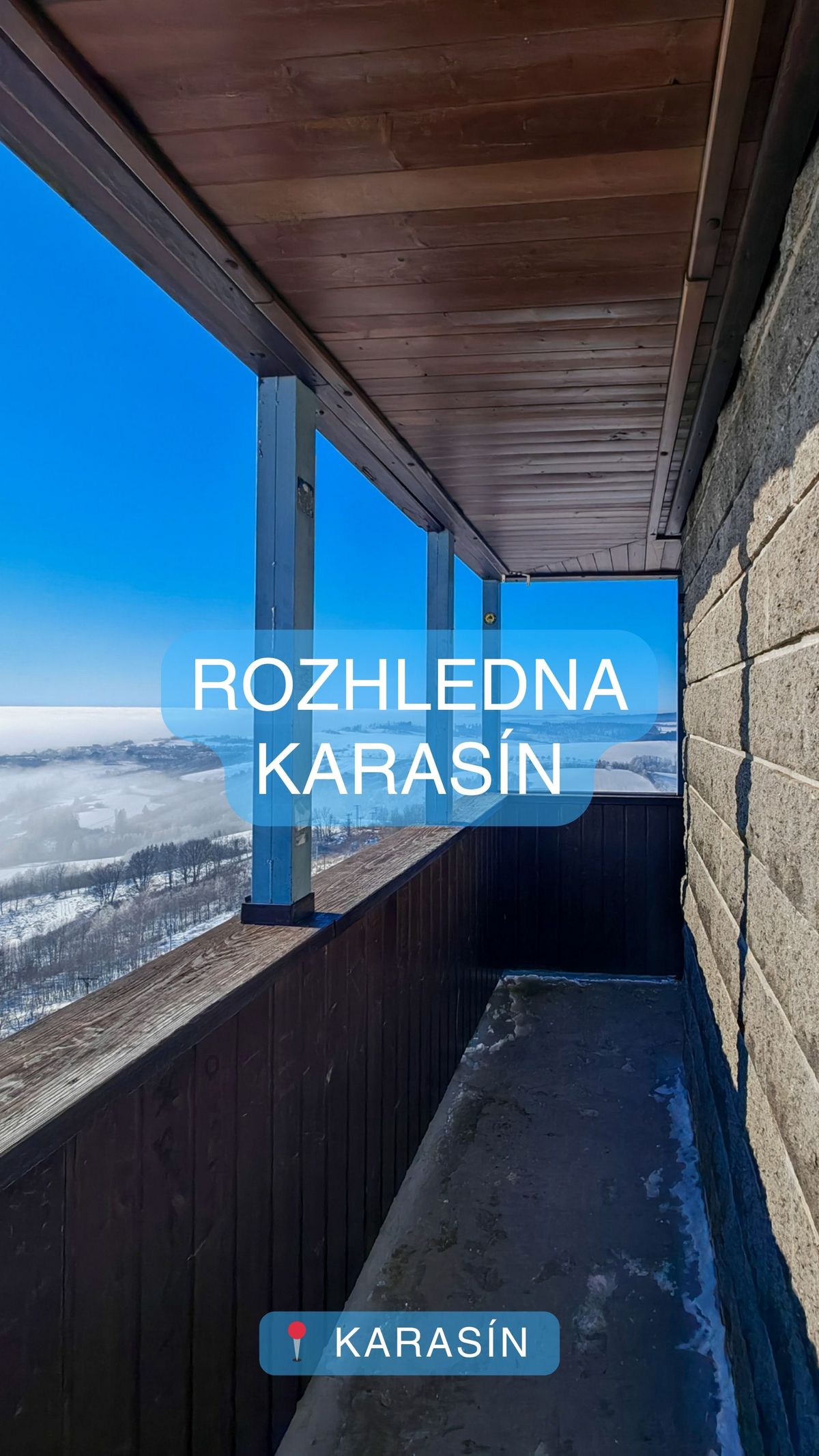 Zděná rozhledna byla otevřena v roce 2002 a na její ochoz vás dovede 128 schodů – odměnou je panoramatický pohled na údolí Vírské přehrady, Bystřici nad Pernštejnem, Vítochov a řadu hradů, vrcholů i okolních rozhleden. Za dobré viditelnosti spatříte Babylon, Horní les, Milenku nebo Babí lom. Do krajiny vystupují také Devět skal, Harusův kopec či Buchtův kopec. Rozhledna Karasín tak nabízí jedinečný rozhled na Křižanovskou pahorkatinu, Arnolecké hory, Svrateckou hornatinu i Žďárské vrchy.