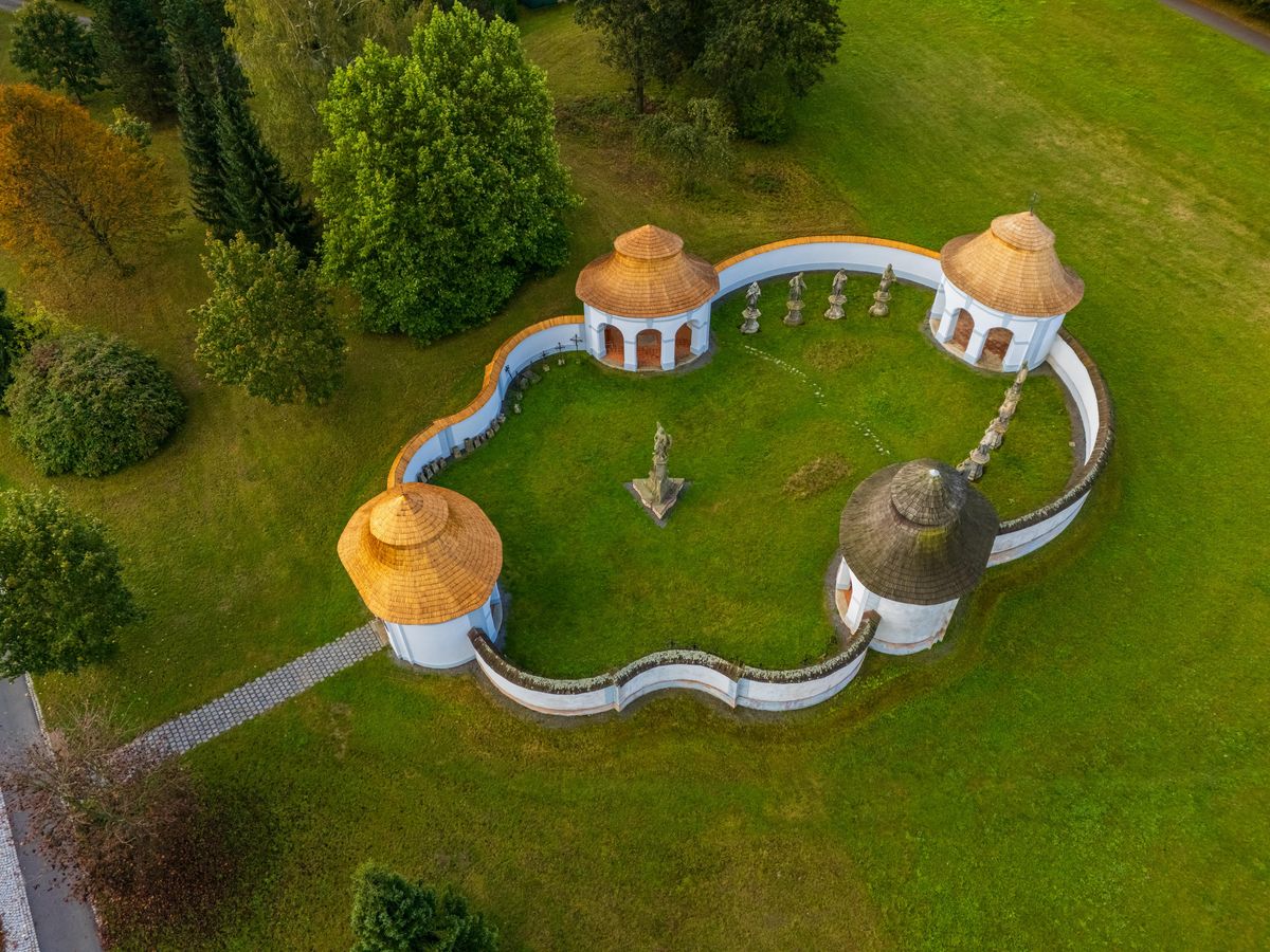 Okolí kostela obklopuje ambit, původně určený pro poutníky, jehož brány se otevírají do krajiny ve tvaru paprsků. Když stojíte na vrcholu a rozhlédnete se kolem, spatříte město Žďár nad Sázavou, rybníky, lesy i klášterní areál – vše jako na dlani. Z této výšky pochopíte, proč je Zelená hora v krajině nejen dominantou, ale i duchovním středem.