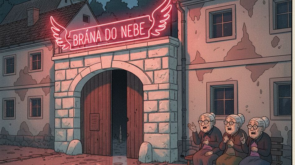 A tak, po sáhodlouhých přípravách Rakvička s Urnovským konečně nad zděnou bránu nainstalovali neonový nápis Brána do nebe, lemovaný andělskými křídly, která večer měla otevřít nebe nad Slezskem a jeho ozdobou - Třebomí, zadluženou nyní jako rozvojová země. Tato křídla ale neměla spasit duše, nýbrž vysávat peněženky jako telešoping důchodce. Chystali se zaútočit na rozvaliny mravní integrity v okruhu alespoň čtyřiceti kilometrů.