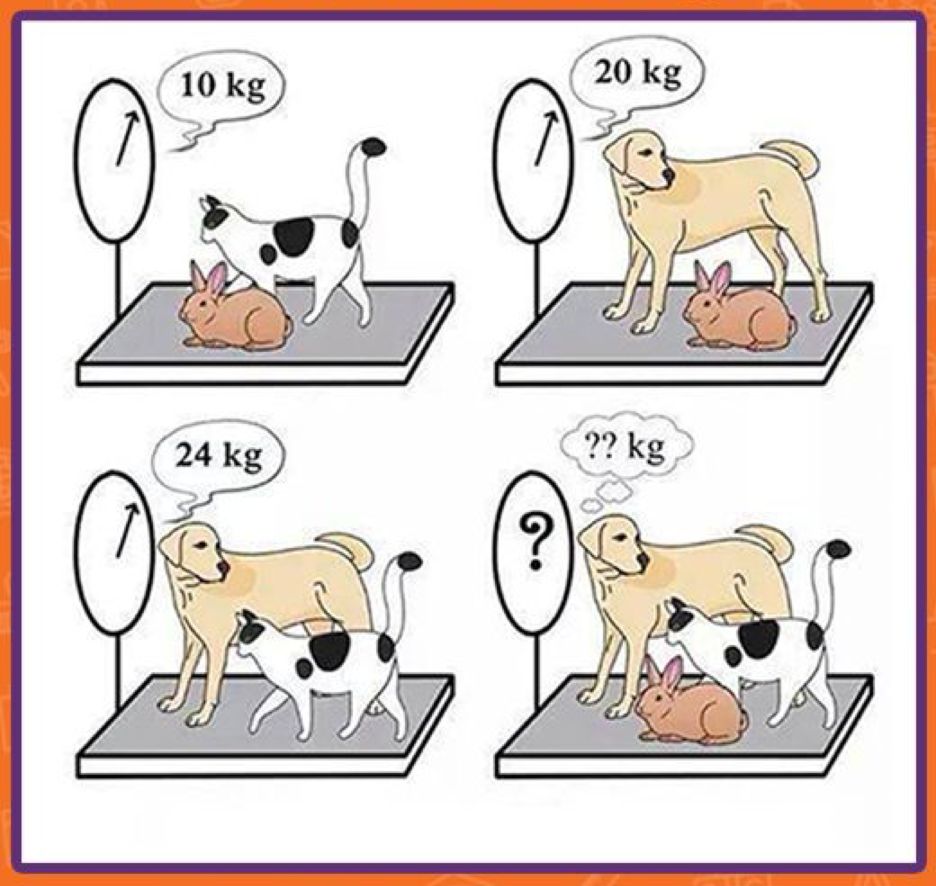 Na obrázku vidíte zvířata na váze. Vaším úkolem je zjistit, kolik váží všichni psi dohromady.