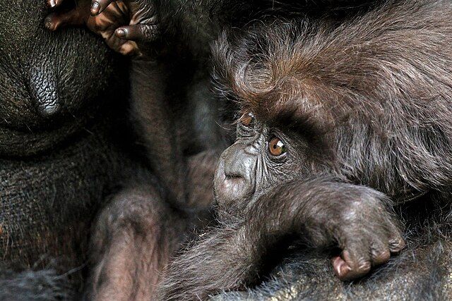 Asi půlroční mládě gorily horské v náručí své matky. Gorily horské se oproti ostatním gorilám můžou pyšnit neobvykle dlouhou srstí