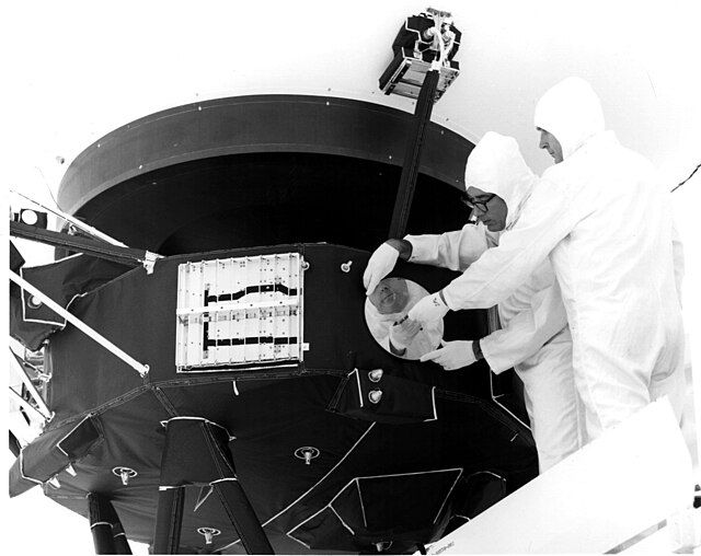 Tým NASA instaluje „Zlatou desku“ na palubu lodi Voyager 1. Zlatá deska obsahuje nahrávky zvuků planety Země pro případ kontaktu s mimozemským životem (červenec 1977)