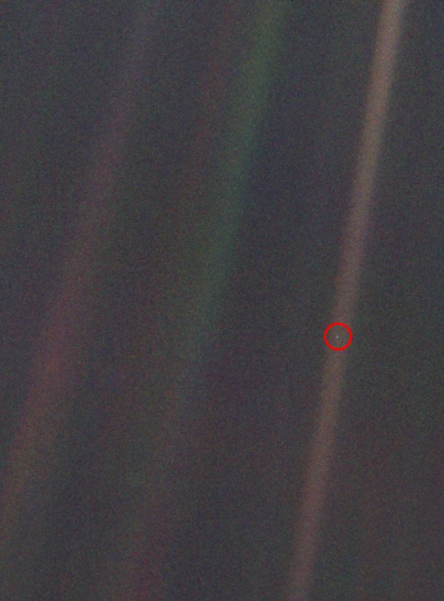 Musíme hodně zamžourat očima, abychom to viděli, ale je to tam. Kdybychom nevěděli, že jde o planetu, těžko bychom tu bleděmodrou tečku rozlišili od omšelé hlavičky špendlíku nebo vpichu po jehle. Při tak velké vzdálenosti má Země úhlový průměr menší, než je rozlišovací schopnost objektivu, a ten jeden rozmlžený pixel je ve skutečnosti ještě méně než pixel. Tak nicotná a nevýznamná se naše Země jeví v porovnání s nekonečnou velkolepostí vesmíru.