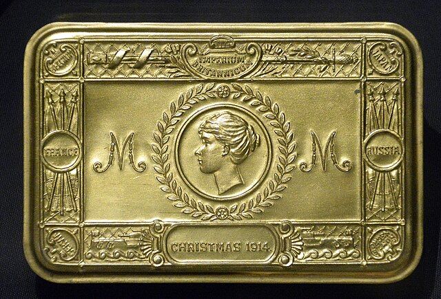 Dárková krabička s čokoládou a tabákem, kterou britským vojákům zaslal král Jiří V. (1914)