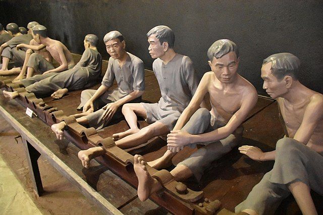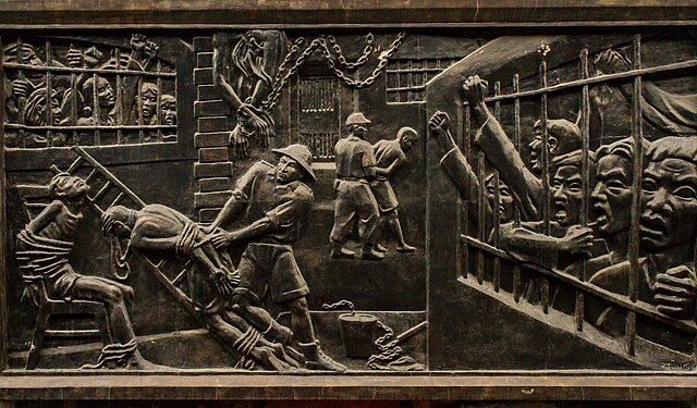Mučící techniky v Hanojském Hiltonu. Plastika na zdi dnešního muzea