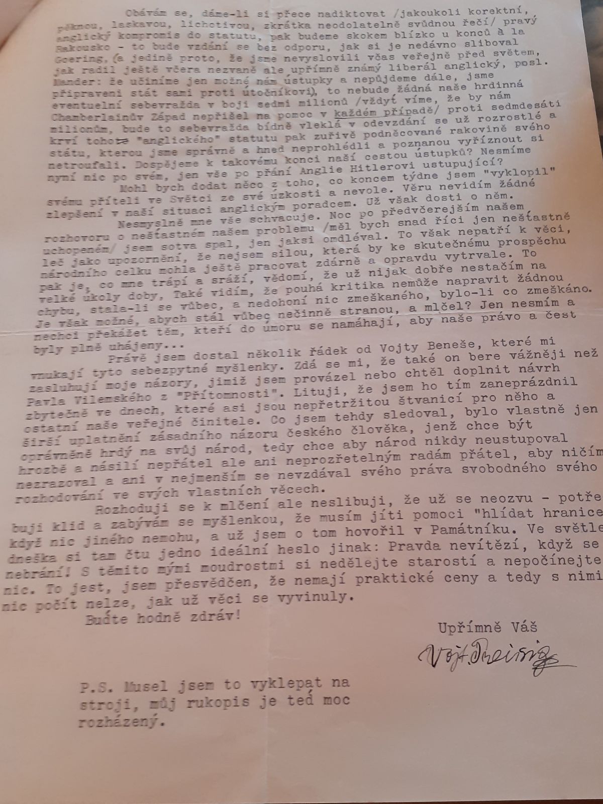 Jen několik týdnů před mnichovským diktátem napsal Vojtěch Preissig dopis Janu Týmlovi. Přiznal obavy ze situace v Československu a z postoje Velké Británie k požadavkům Hitlera.