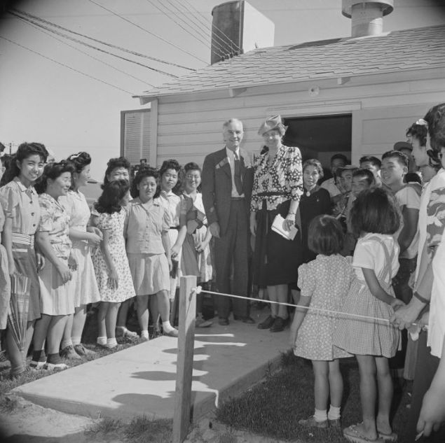 Eleonor Rooseveltová při návštěvě tábora v Gila River, doprovází ji Dillon Myer