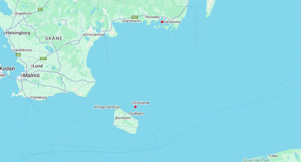 Mapa s vyznačením Karlskrony a ostrova Christiansø, kde se měla ponorka dle Sovětů nacházet