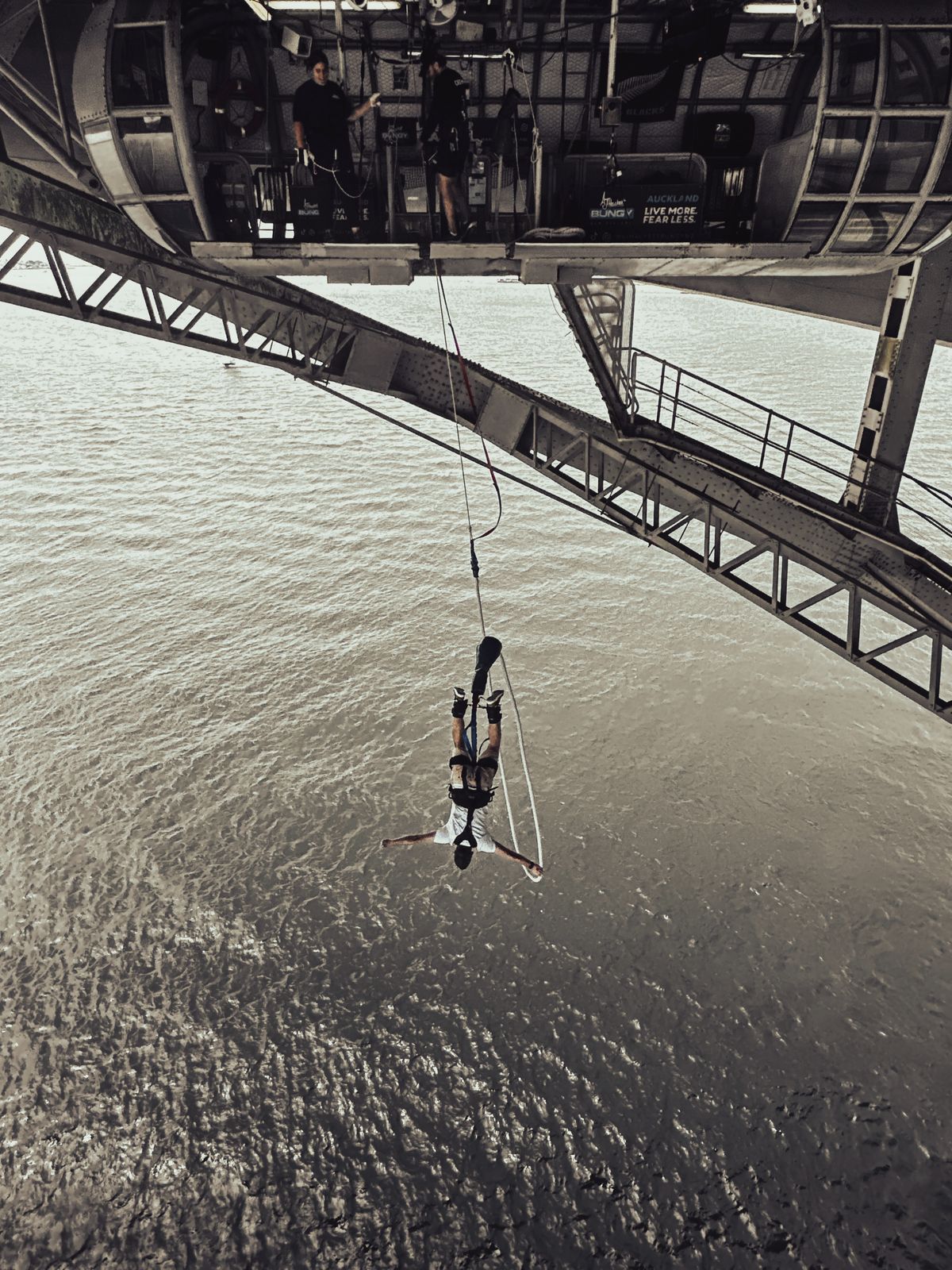 Nový Zéland je rodištěm adrenalinových sportů, jejichž hlavním městem a pomyslnou mekkou je rozhodně Queenstown. Tam jsem se bohužel tentokrát nevydal, ale i v Aucklandu provozuje společnost A.J. Hackett, která působí v celé zemi, několik adrenalinových zážitků. Jedním z nich je Auckland Bridge Bungy - tedy bungee jumping z místní přístavní dominanty Harbour Bridge. V Aucklandu právě probíhaly závody světového poháru plachetnic, takže byl záliv pro různé aktivity uzavřen. Skočit z mostu mi ale vyšlo - objednáno jsem měl předem a skákal jsem jako poslední před tím, než byl pro ten den záliv uzavřen, takže jsem byl na mostě sám. Jinak se jedná o skupinovou záležitost a v jedné várce jde postupně skákat zhruba 12 lidí.