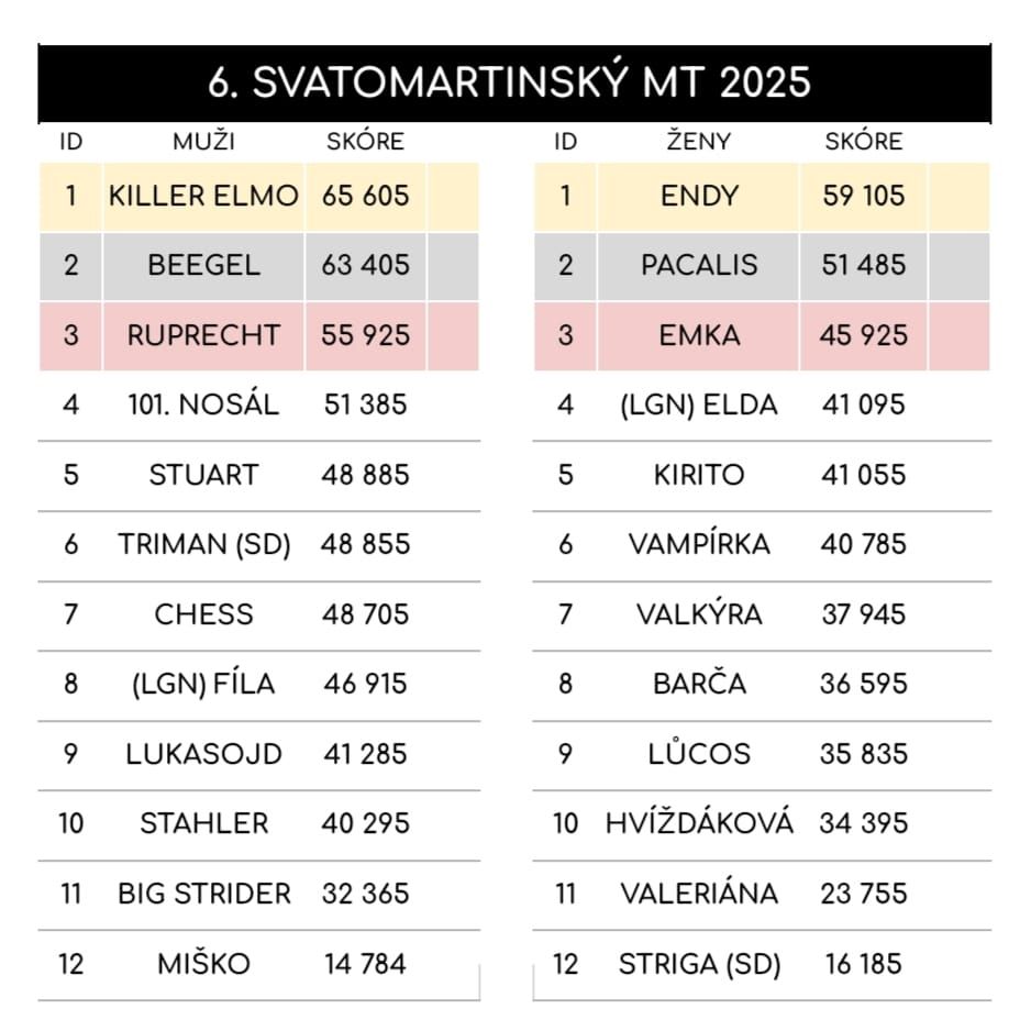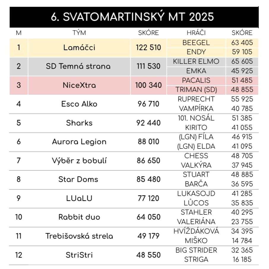 Šampionem večera se stal tým Lamáčci (Adam Varhol - Beegel a Anna Málková - Endy). Oba hráči z Říčan u Prahy nejen vyhráli turnaj, ale skórem 122 510 bodů vytvořili nový Svatomartinský rekord, který překonal ten starý z roku 2022 o více než 3 000 bodů!