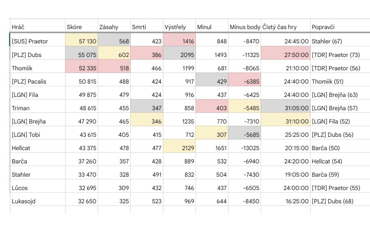 Ačkoli jsou aktuální pravidla neúprosná je zajímavé že dva z hráčů s největší penalizací se přesto umístili na medailové pozici. Penalizace za smrt (-10 bodů) a střely mimo (-5 bodů) drasticky mění pořadí. Pokud bychom tyto „tresty“ odstranili a hodnotili pouze čistý útočný zisk, tabulka by se obrátila vzhůru nohama. Hráč Hellcat, který v oficiálním pořadí skončil devátý, by se stal s obrovským náskokem vítězem. To otevírá otázku pro příští kola: Je lepší být efektivním lovcem, který se skrývá, nebo agresivním predátorem, který ovládne prostor za cenu vlastních ztrát?